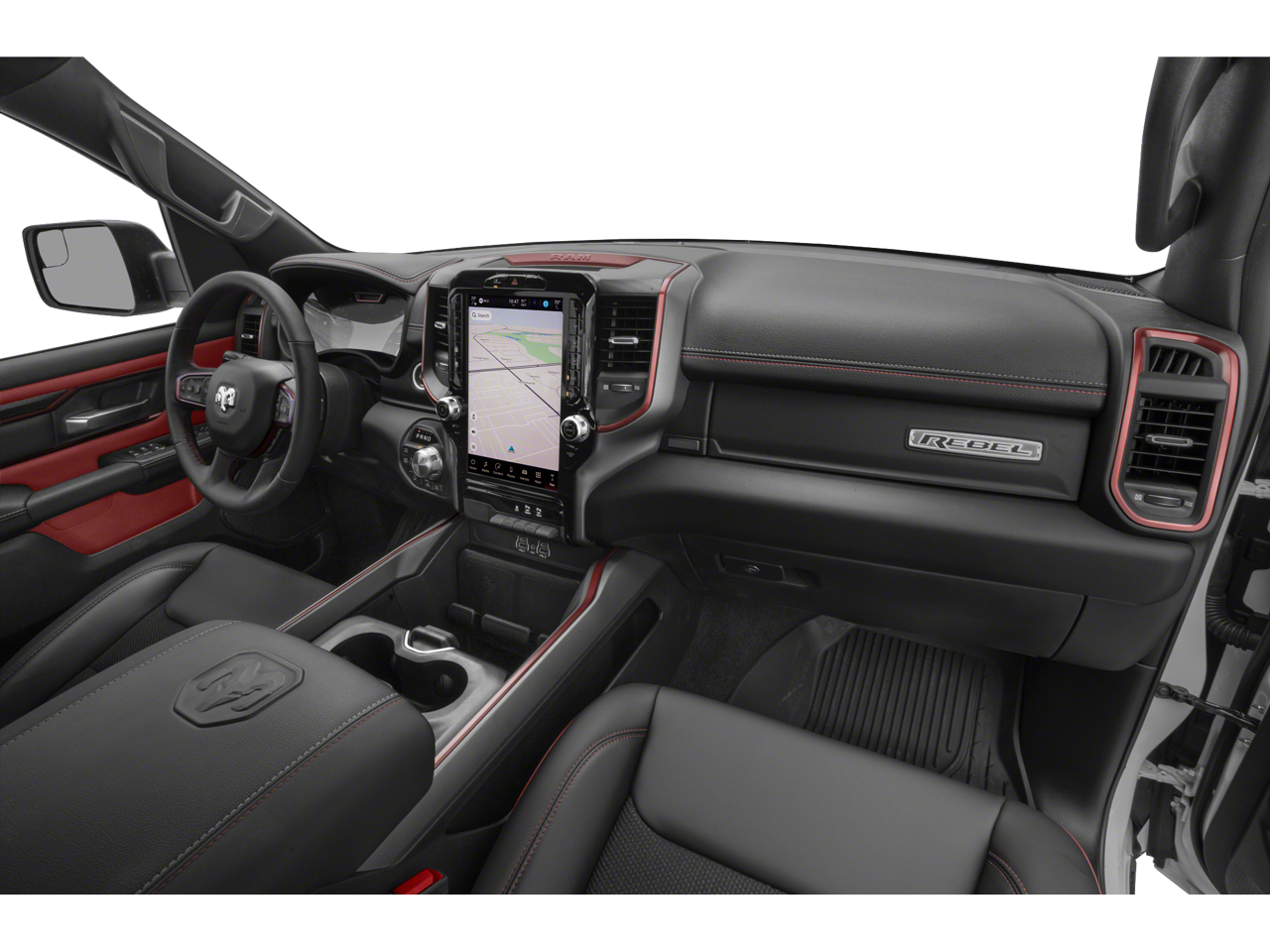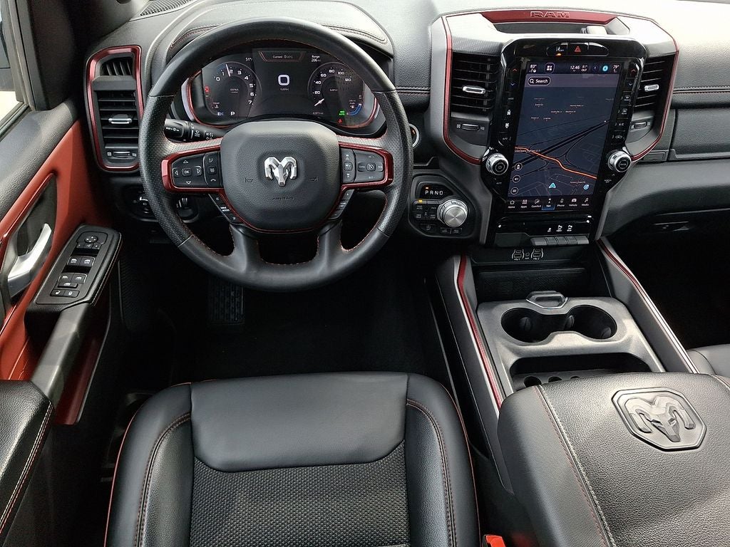 THIS VEHICLE INCLUDES THE FOLLOWING FEATURES AND OPTIONS: Quick Order Package 21W Rebel, Rebel Level 1 Equipment Group (Auto Power-Folding Mirrors, Auto-Dimming Exterior Driver Mirror, Black Premium Power Mirrors, Convex Wide-Angle Exterior Mirror Insert, Exterior Mirrors Courtesy Lamps, Exterior Mirrors w/Heating Element, Exterior Mirrors w/Supplemental Signals, Power Adjustable Pedals, Rear Window Defroster, Remote Tailgate Release, and Wireless Charging Pad), 10 Speakers, 3.92 Rear Axle Ratio, 4 Way Front Headrests, 4-Wheel Disc Brakes, 4G LTE Wi-Fi Hot Spot, ABS brakes, Air Conditioning, Alloy wheels, AM/FM radio: SiriusXM with 360L, Apple CarPlay, Apple CarPlay/Android Auto, Auto High-beam Headlights, Auto-dimming Rear-View mirror, Automatic temperature control, Brake assist, Bucket Seats, Cloth/Vinyl Bucket Seats, Compass, Connected Travel & Traffic Services, Connectivity - US/Canada, Delay-off headlights, Driver door bin, Driver vanity mirror, Dual front impact airbags, Dual front side impact airbags, Electronic Stability Control, Front anti-roll bar, Front Bucket Seats, Front Center Armrest w/Storage, Front dual zone A/C, Front fog lights, Front License Plate Bracket, Front reading lights, Front Seat Back Map Pockets, Front wheel independent suspension, Full Length Upgraded Floor Console, Fully automatic headlights, Garage door transmitter, Google Android Auto, GPS Antenna Input, GPS Navigation, Heated door mirrors, Heated front seats, Heated steering wheel, Illuminated entry, Integrated Voice Command w/Bluetooth®, Leather steering wheel, Low tire pressure warning, Manual Folding Exterior Mirrors, Manufacturer's Statement of Origin, Navigation System, Occupant sensing airbag, Outside temperature display, Overhead airbag, Overhead console, Panic alarm, ParkView Rear Back-Up Camera, Passenger door bin, Passenger vanity mirror, Power Adjust 8-Way Driver Seat, Power door mirrors, Power driver seat, Power steering, Power windows, Radio data system, Radio: Uconnect 5 Nav w/12.0 Display, Rear 60/40 Folding Seat, Rear anti-roll bar, Rear seat center armrest, Rear step bumper, Remote keyless entry, SiriusXM w/360L, Speed control, Split folding rear seat, Steering wheel mounted audio controls, Tachometer, Telescoping steering wheel, Tilt steering wheel, Traction control, Trip computer, USB Host Flip, Variably intermittent wipers, Voltmeter, and Wheels: 18 x 8.0 Painted Mid-Gloss Black.