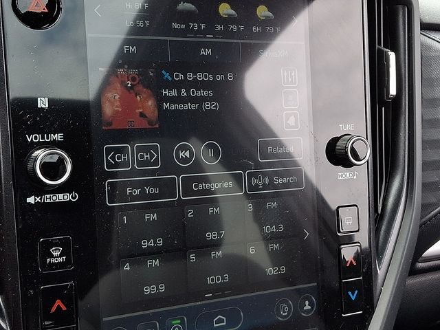- Radio: Subaru 11.6" Multimedia Plus System -inc: valet mode, integrated center information display, AM/FM stereo HD Radio, multi-touch gesture high resolution display screen, voice activated controls, Bluetooth® audio streaming and hands-free phone connectivity w/SMS text messaging connectivity (refer to subaru.com for cell phone compatibility), iPod control capability, SiriusXM w/360L (4 months free trial/subscription required after), SiriusXM Travel Link (3 years free trial/subscription required after), smartphone integration for Android Auto and Apple CarPlay w/full screen view and wireless connection, USB and Over The Air (OTA) audio system update, steering wheel control switches for audio and Bluetooth®, 6 speakers, 3.5mm auxiliary input jack and roof mounted audio and satellite antenna